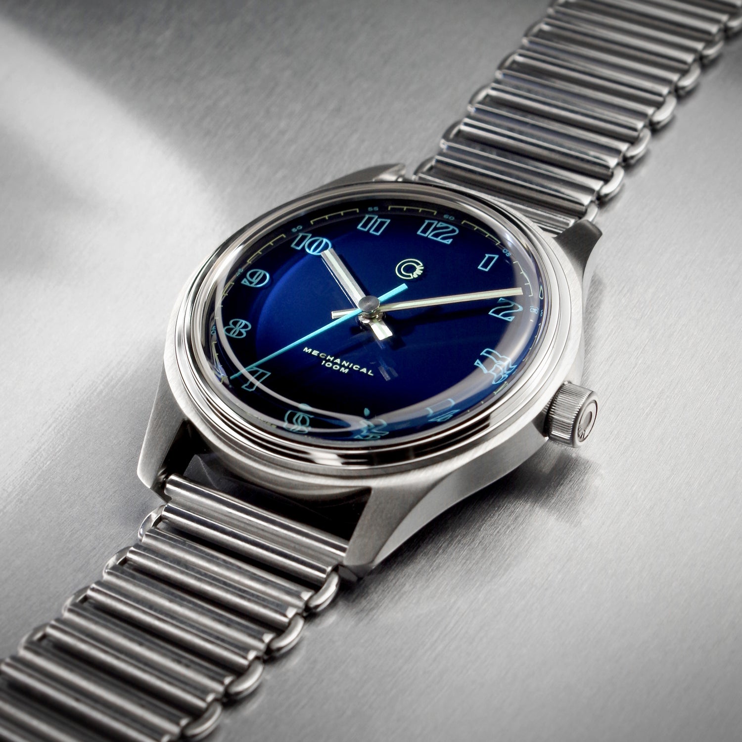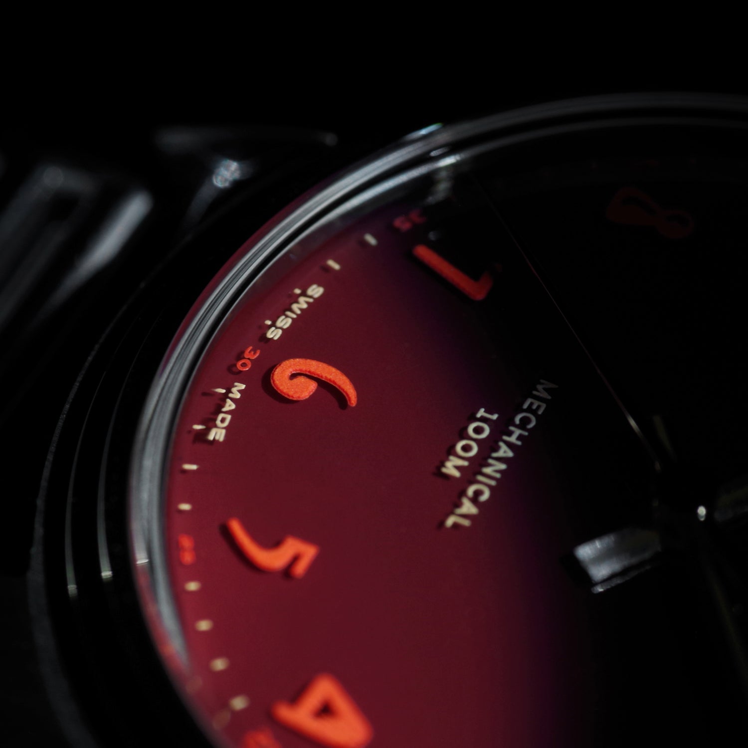 The dials are the deepest, most lustrous polished lacquer physically possible. Fifteen layers of stove-enamelled Berlac Swiss lacquer, hand-rubbed and oven-cured, for a total thickness of 1.3mm. The slim case and crystal, at 10mm, could have been even slimmer were it not for that excessively, luxuriously thick dial. Floating above the sea of color is a joyous celebration of unique typography, each dial telling its own story.