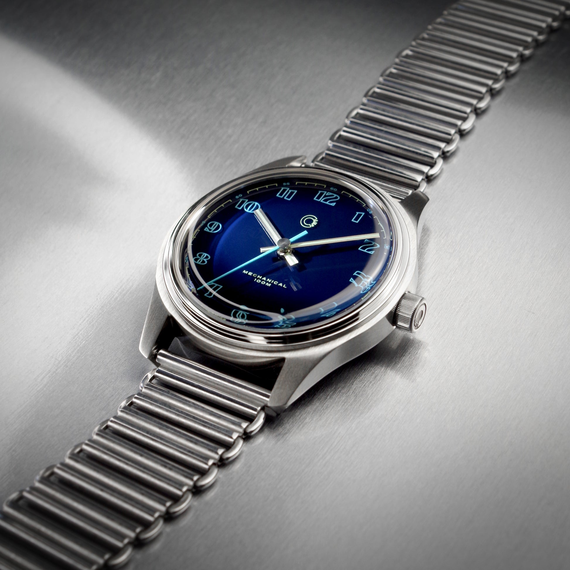 Three straps are included with every watch: water-resistant Cordura nylon with bright blue backing, soft Italian full grain leather with blue cross stitching, and a vintage Bonklip-style steel bracelet with a utilitarian elegance and lightness perfectly matched to the slim watch case. The stainless steel pin buckle was custom designed and micro metal injection molded (µMIM) from 316L stainless steel, the same additive process used for precise miniature machine parts, reducing material waste when compared to CNC.