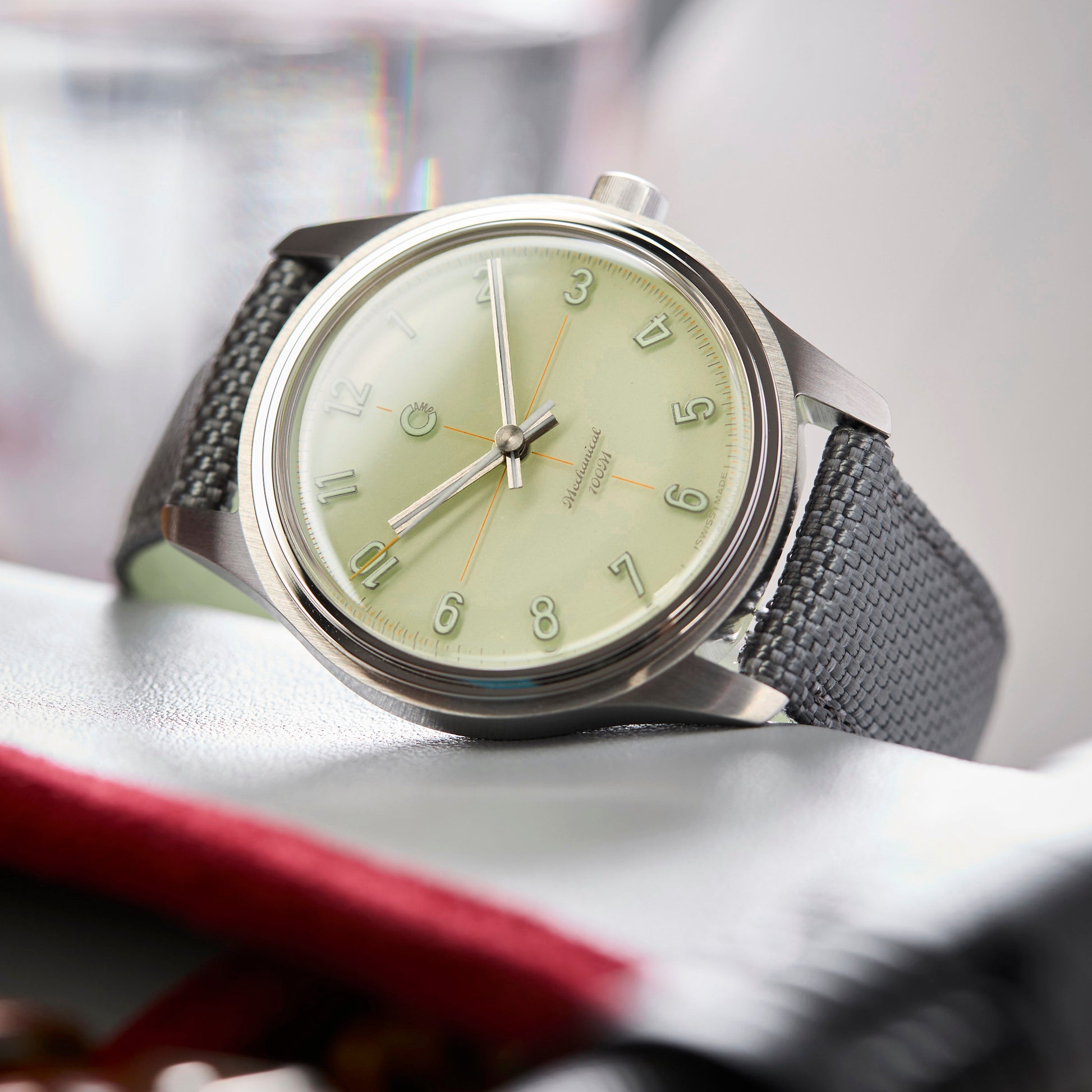 Three straps are included with every watch: water-resistant Cordura nylon with green lining, soft Italian full grain leather with green cross stitching, and a vintage Bonklip-style steel bracelet with a utilitarian elegance and lightness perfectly matched to the slim watch case. The stainless steel pin buckle was custom designed and micro metal injection molded (MIM) from 316L stainless steel, the same additive process used for precise miniature machine parts, reducing material waste when compared to CNC.