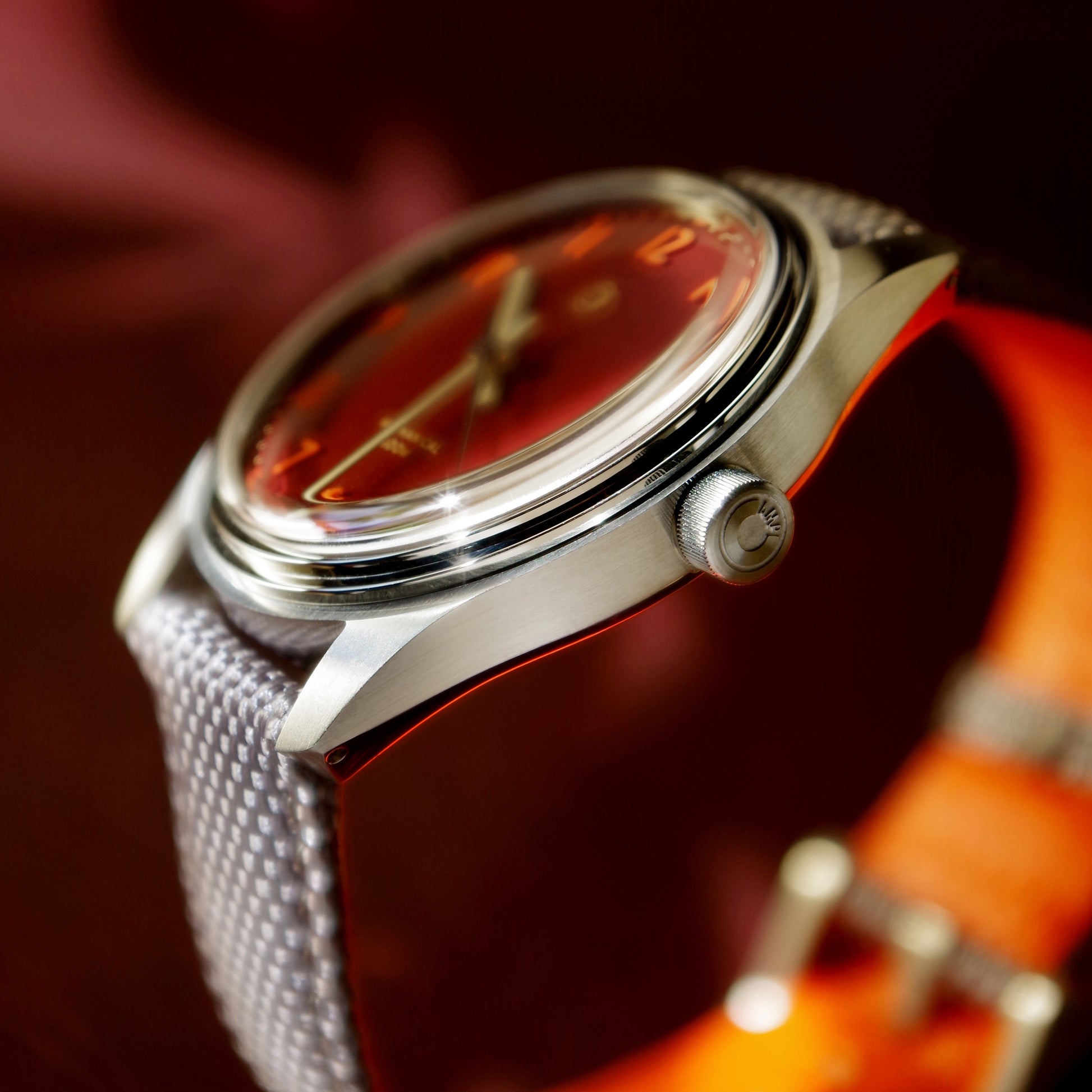 Three straps are included with every watch: water-resistant Cordura nylon with orange lining, soft Italian full grain leather with orange cross stitching, and a vintage Bonklip-style steel bracelet with a utilitarian elegance and lightness perfectly matched to the slim watch case. The stainless steel pin buckle was custom designed and micro metal injection molded (MIM) from 316L stainless steel, the same additive process used for precise miniature machine parts, reducing material waste when compared to CNC.